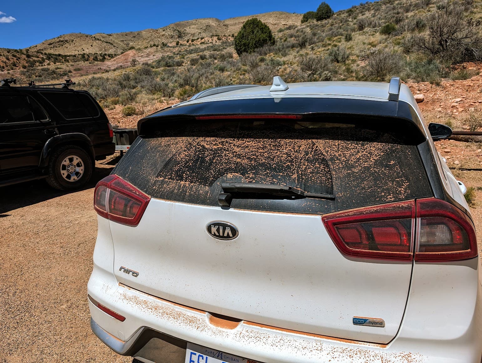 Off the highway, it's over 8 miles of bumpy dirt road. And no cell reception. Like driving on Mars, very red and rocky. It would've been a blast if I had an off-road vehicle (and one I didn't need to maintain), but it felt a bit dicey with my city-slickin' Kia. I really wasn't sure if it was gonna make it, but I just drove slowly and carefully, and it got there in one piece. Just got a bit dusty.